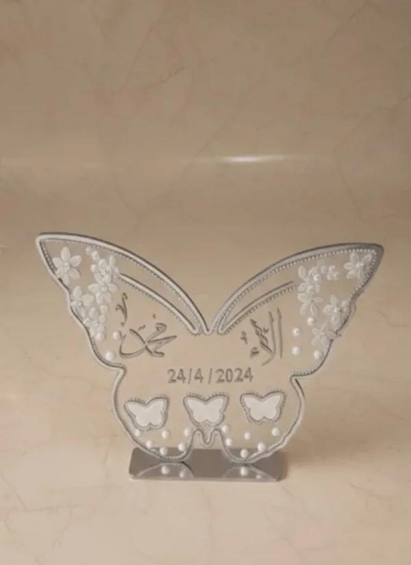 قطعة ديكور فنية وجريئة على شكل فراشة كبيرة، مصنوعة من الأكريليك الشفاف عالي الجودة.