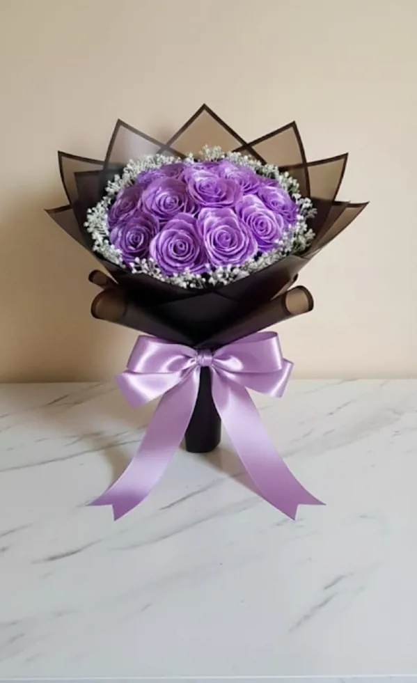 لأنه لا يقدم ورداً فقط، بل بيان أناقة يجمع بين سحر اللون الموف الملكي وأناقة التغليف الأسود الحديث في تحفة واحدة.