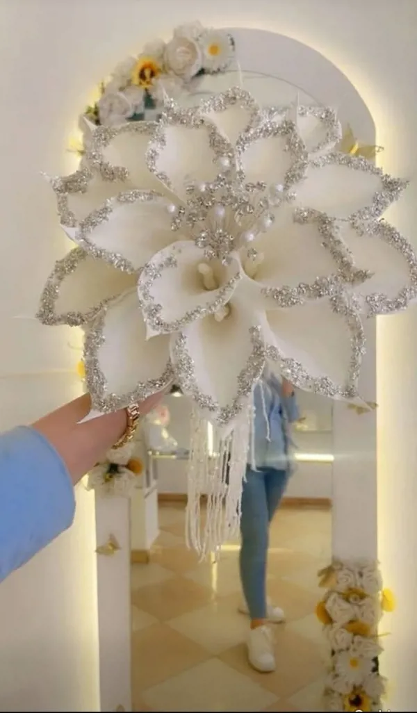 حيث تُرصع حواف البتلات بتفاصيل فضية لامعة تخلق تبايناً جذاباً.