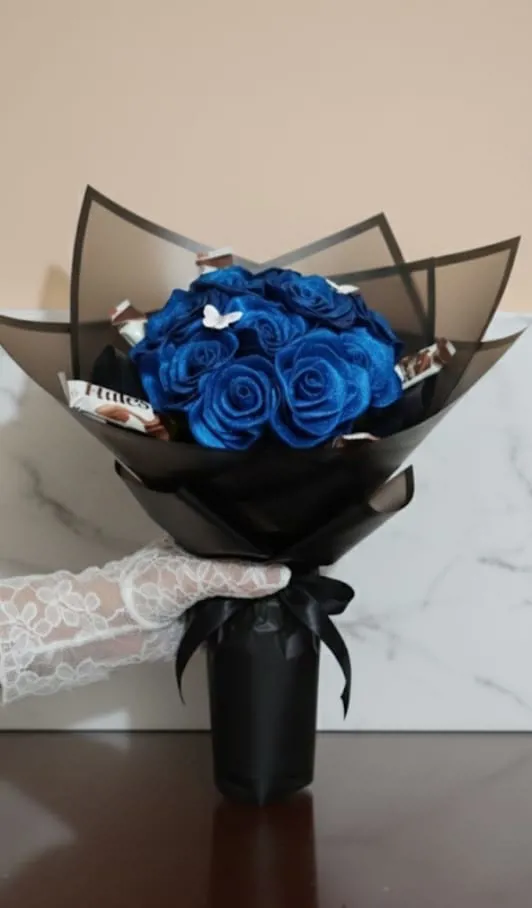 بوكيه ورد باللون الأزرق الملكي الفريد والساحر، مُرافق بصندوق شوكولاتة فاخر، مُغلف بتغليف أنيق يُبرز جماله.