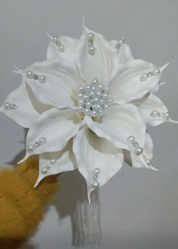 باقة "كالا اللؤلؤ" الفاخرة، عبارة عن زهرة كالا بيضاء ناصعة مصممة يدوياً بتقنية عالية لتجسد الجمال الملكي في أبهى صوره.