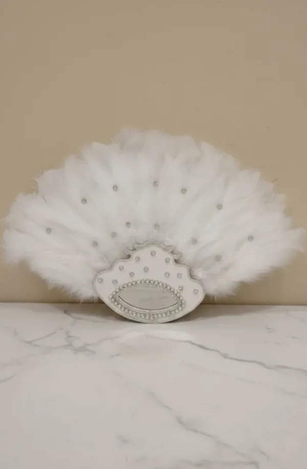 مروحة عروس فاخرة تجمع بين أناقة الريش الطبيعي وبريق الستراس المتلألئ.